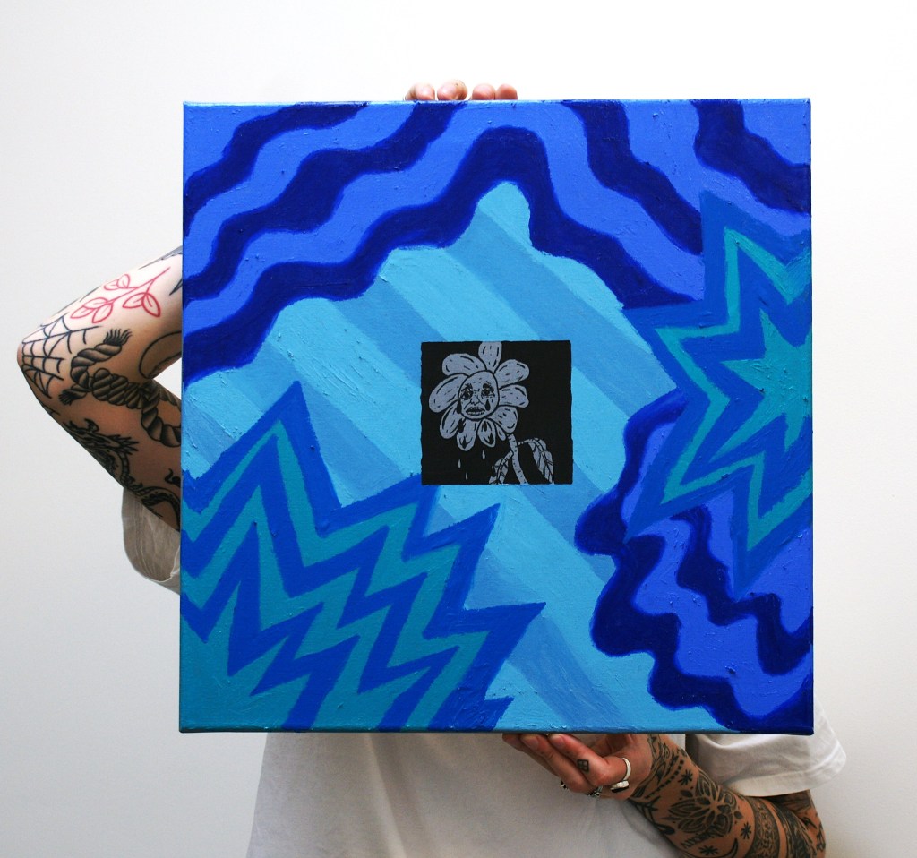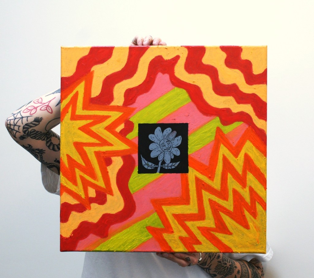 Oil pastels and paint marker on 3 50×50 canvases