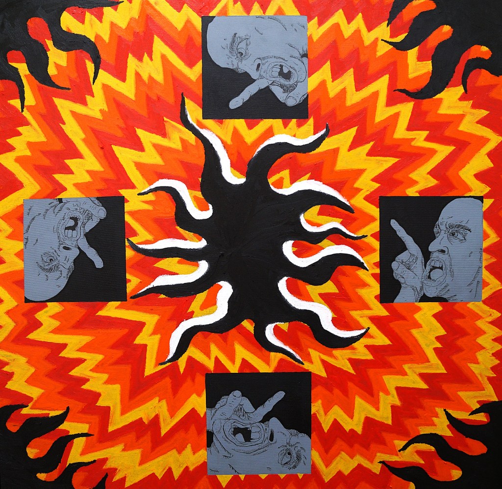 This painting was inspired by the constant circle of screaming that seems to go on in politics, in social circles, and also the constant dialogue going on inside of my head. A constant cycle of pointing fingers and shifting blame, with no results ever.