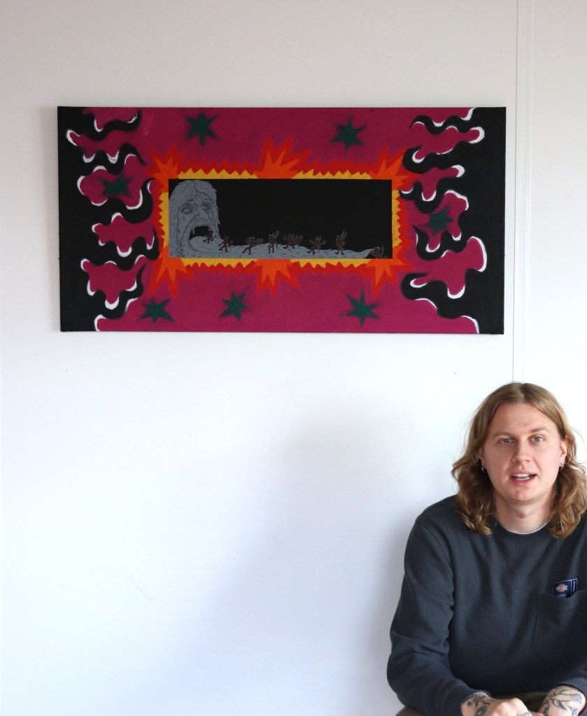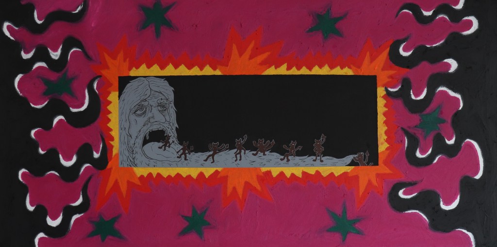 We live in a society where good is often portrayed as bad and bad is portrayed as good. Leftist organisations are villified while the rich corporations they protest against are ruining the planet and social environment. I often try to put this situation in the frame of religion. We are told there is a righteous party and a wrong one but can we trust that information. With God as a totalitarian ruler, is he/she/they truly benign? The devil was a revolutionary, what if he had the best intentions for us in mind? And if the forces of hell are actually righteous, aren’t they just feeding into the plan of the rulers by protesting/fighting?Questions like these lead to paintings like this.